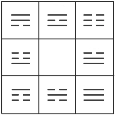 À mon avis, le bagua est l’élément emblématique du fengshui. Il permet d’identifier différentes énergies dans l’habitation. Pour commencer, il est représenté symboliquement par un positionnement de huit trigrammes (trois traits) dans un carré de 9 cases.